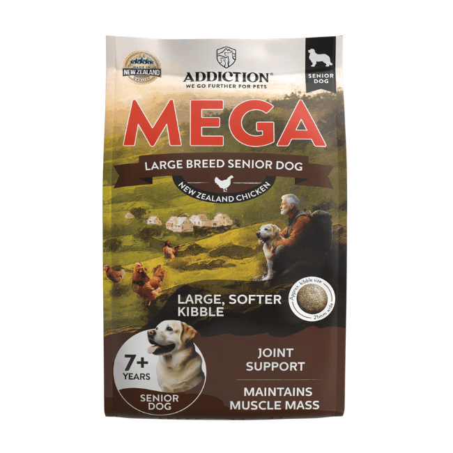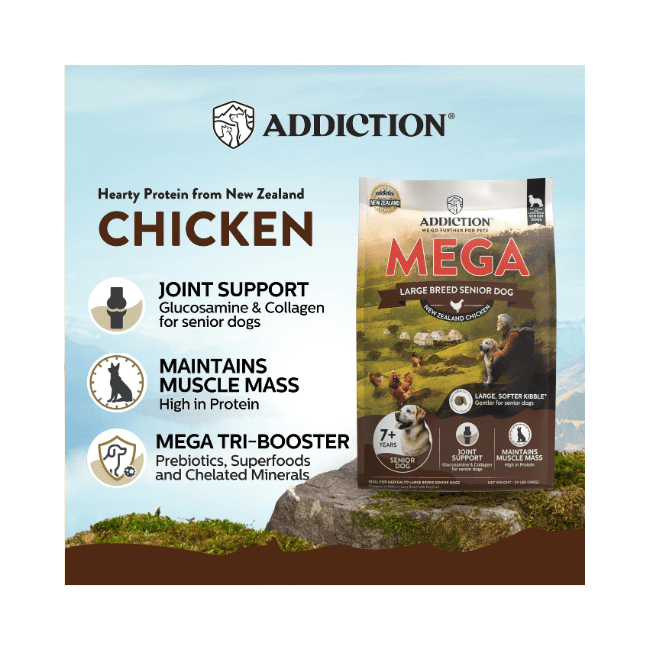 Big dogs have different needs at every stage of life. Help your senior dog live life to the fullest with MEGA Chicken Large Breed Senior Dog Food, ideal for medium to large breed dogs ages 7+ years old. This premium, complete and balanced lifestage dog food, designed by animal nutritionists keeps your senior dog enriched and energetic with the proper levels of protein, minerals, glucosamine, and collagen. With Addiction Chicken Large Breed Senior Food, your senior dog can continue to live their big life!