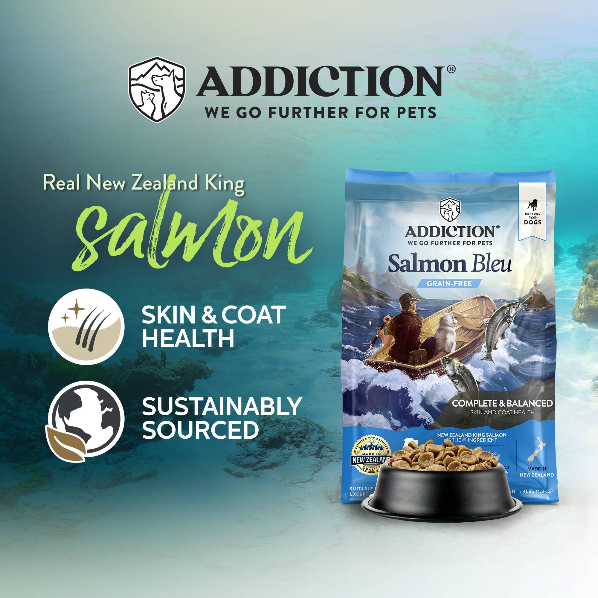 Addiction Salmon Bleu is a grain-free, complete and balanced diet for dogs that uses New Zealand King Salmon as the #1 ingredient. Rich in Omega fatty acids from Salmon and Flaxseed, this formula helps promote your dog’s skin and coat health. Salmon Bleu for dogs is enriched with Taurine, Glucosamine and Chelated Minerals for heart health, joint health, and improved nutrient absorption.