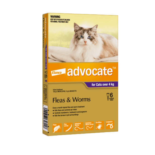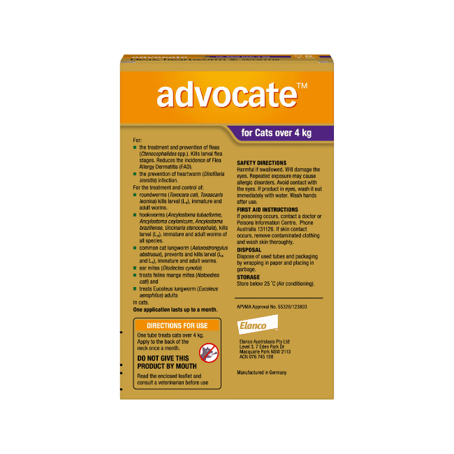 Advocate is a fast-acting, water resistant, easy to apply monthly spot-on offering comprehensive parasite protection. It kills fleas fast and on contact, so there’s no need for them to bite. Reinfesting fleas stop biting in 3-5 minutes and are killed within 1 hour. Larval flea stages are killed in the cat’s surroundings, and it reduces the incidence of flea allergy dermatitis. Also treats and controls mange and ear mites. Advocate prevents heartworm disease and treats and controls adult & juvenile stages of roundworms and hookworms. Advocate is unique, providing ongoing protection from new worm infestations between treatments, meaning less egg shedding and risk of disease. Advocate is the only product that protects against both lungworm species. Safe for use in kittens from 9 weeks of age and any weight. Also safe for use on ferrets from 0.8 kg for flea and heartworm protection.