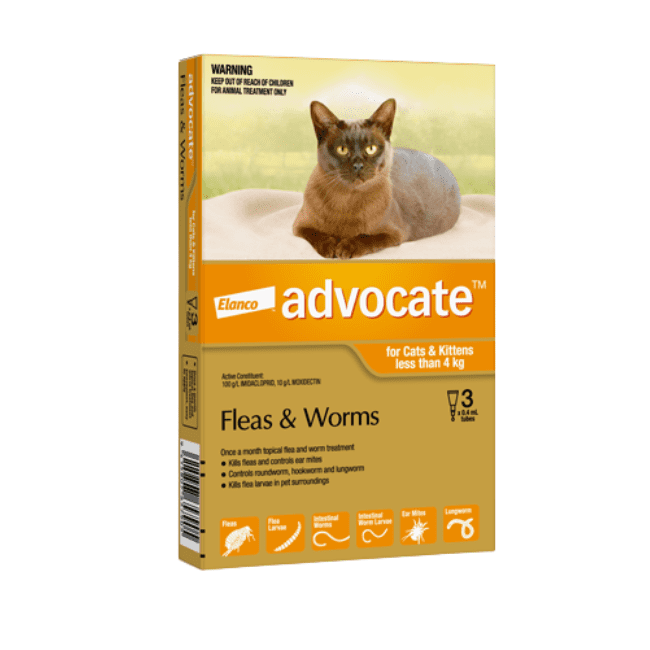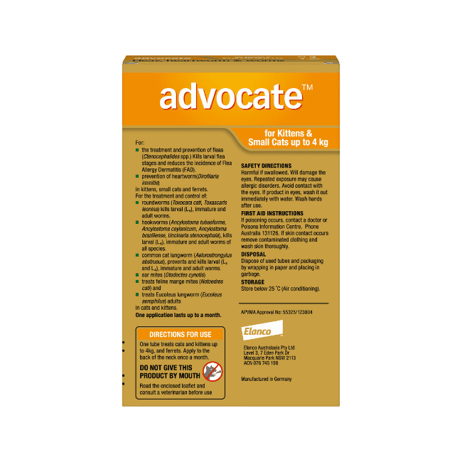 Advocate is a fast-acting, water resistant, easy to apply monthly spot-on offering comprehensive parasite protection. It kills fleas fast and on contact, so there’s no need for them to bite. Reinfesting fleas stop biting in 3-5 minutes and are killed within 1 hour. Larval flea stages are killed in the cat’s surroundings, and it reduces the incidence of flea allergy dermatitis. Also treats and controls mange and ear mites. Advocate prevents heartworm disease and treats and controls adult & juvenile stages of roundworms and hookworms. Advocate is unique, providing ongoing protection from new worm infestations between treatments, meaning less egg shedding and risk of disease. Advocate is the only product that protects against both lungworm species. Safe for use in kittens from 9 weeks of age and any weight. Also safe for use on ferrets from 0.8 kg for flea and heartworm protection.