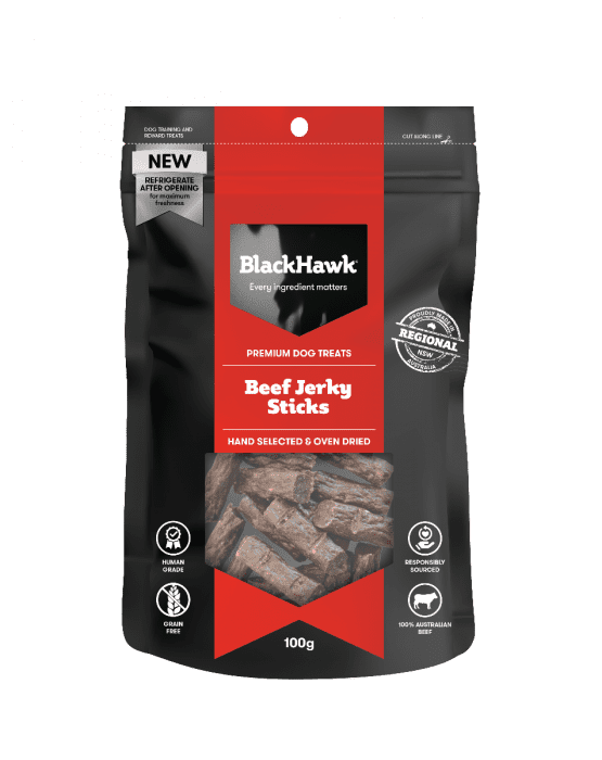 New Black Hawk Beef Jerky Sticks for dogs deliver nature’s goodness from the paddock to your best friend. Fresh from the farm, responsibly sourced human-grade meats are hand-selected, cut and slowly oven-dried to lock in nutrients and flavour. Ideal as a tasty, healthy reward for small to medium dogs over 12 months of age.