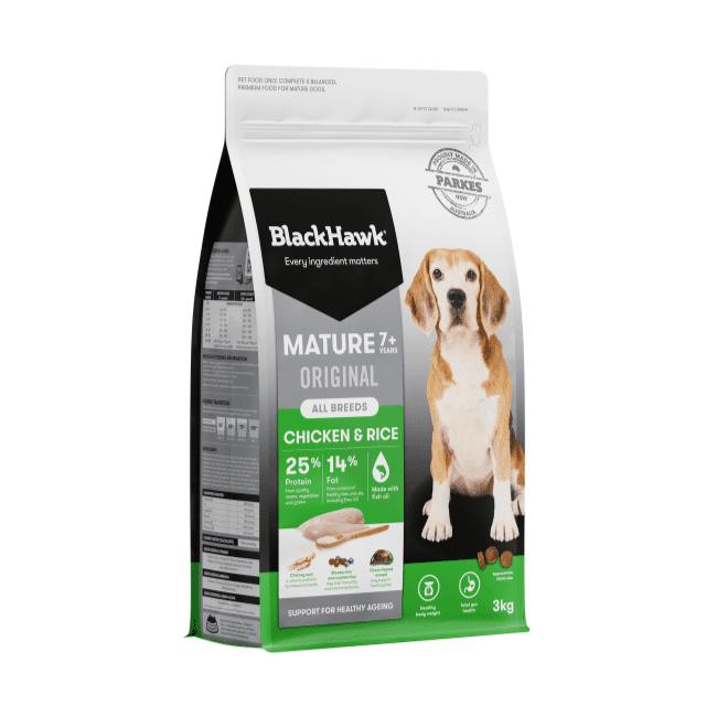 This wholesome, balanced food is designed to meet the nutritional needs of mature dogs, aged 7+. Containing a range of ingredients to support healthy ageing, including real Australian chicken for strong muscles, healthy bones and vitality; chicory root, a natural prebiotic for intestinal health; blueberries and cranberries, which may help immunity and natural defenses; and green-lipped mussels which may support healthy joints.