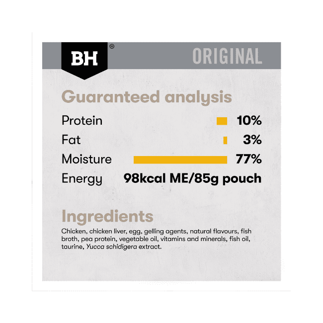 Chicken, chicken liver, egg, gelling agents, natural flavours, fish broth, pea protein, vegetable oil, vitamins and minerals, fish oil, taurine, Yucca schidigera extract.