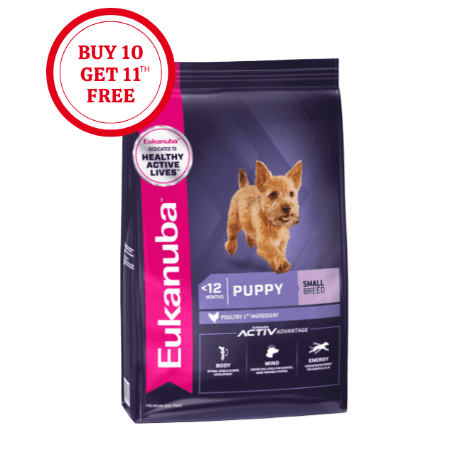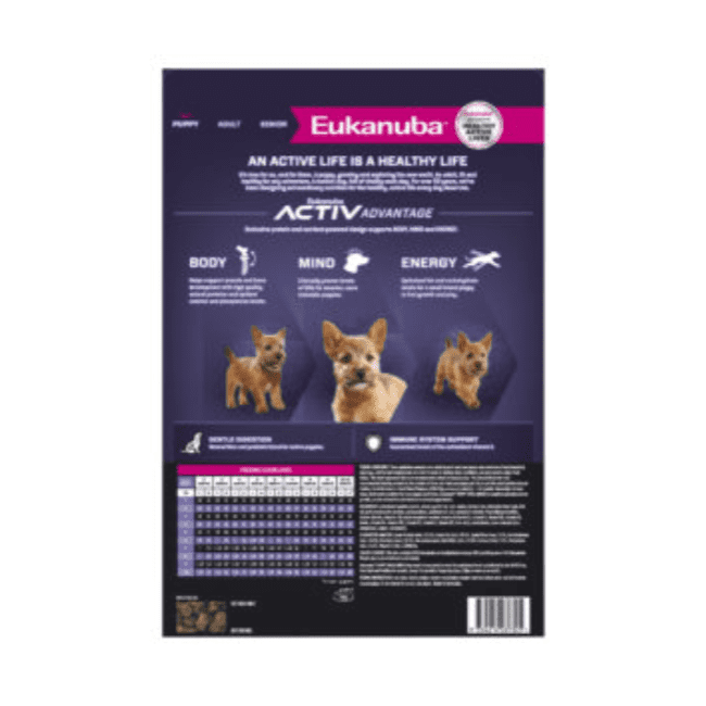Eukanuba™ Puppy for Small Breed provides optimal nutrition for small breed puppies (adult body weight 1-10kg) It offers high protein and fat levels, specially designed for small breed puppy’s higher metabolism. This is because small breed puppies burn more calories and need more energy per kg of bodyweight vs. larger breed puppies.