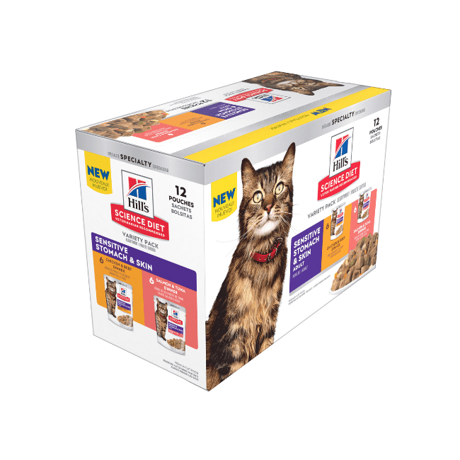 Elevate your cat’s mealtime with Hill’s Science Diet Adult Sensitive Stomach & Skin wet cat food pouches. Mealtime will never be boring again with these flavours that will satisfy your cat’s curious instinct. With chicken & beef, salmon & tuna flavours these convenient pouches serve up tasty chunks in a delicious gravy, supporting digestive health, nourishing skin, and promoting a lustrous fur. Use them as a standalone meal or kibble topper for balanced nutrition. Perfect for healthy adult cats with sensitive stomachs and skin. Give your kitty the tasty and nutritious meal they deserve!
