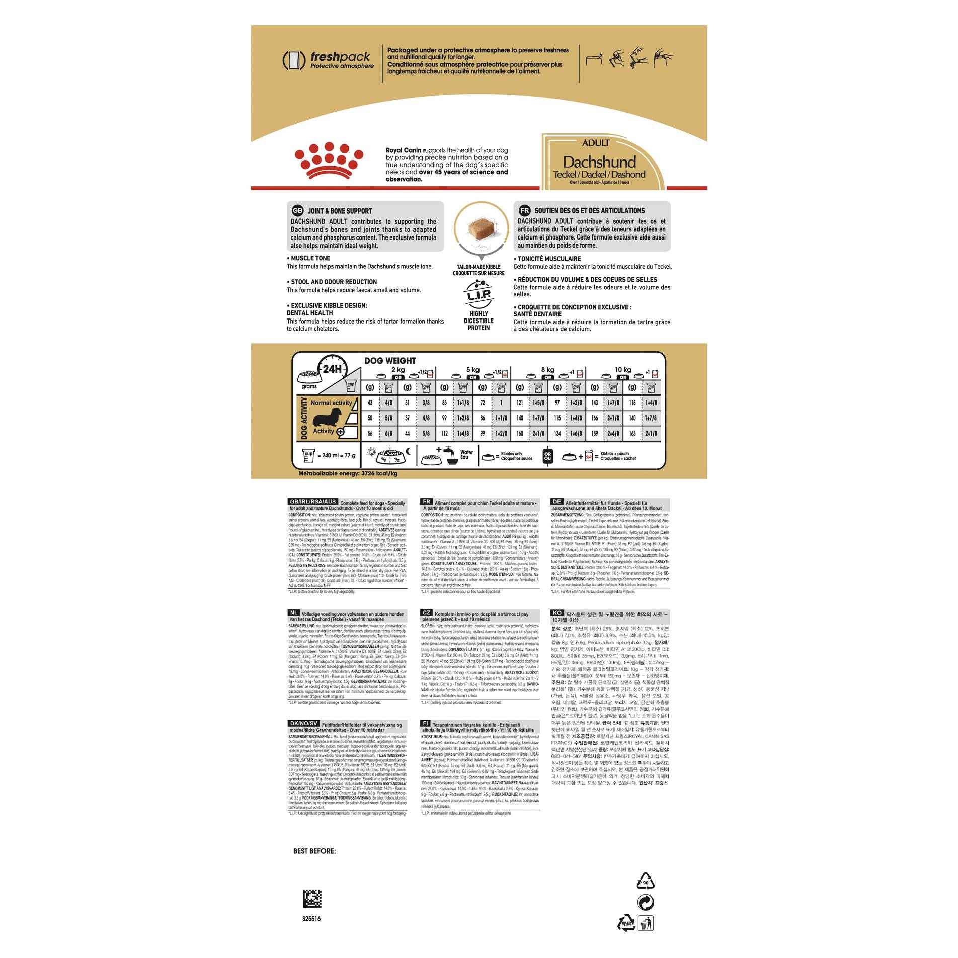 Dachshunds’ little legs have to be strong and always on the go. Chondroitin and glucosamine are key ingredients of this diet to help promote healthy bones and joints. An adapted content of calcium and phosphorus helps support the Dachshund’s short limbs and vertebrae that are subject to severe mechanical stresses.