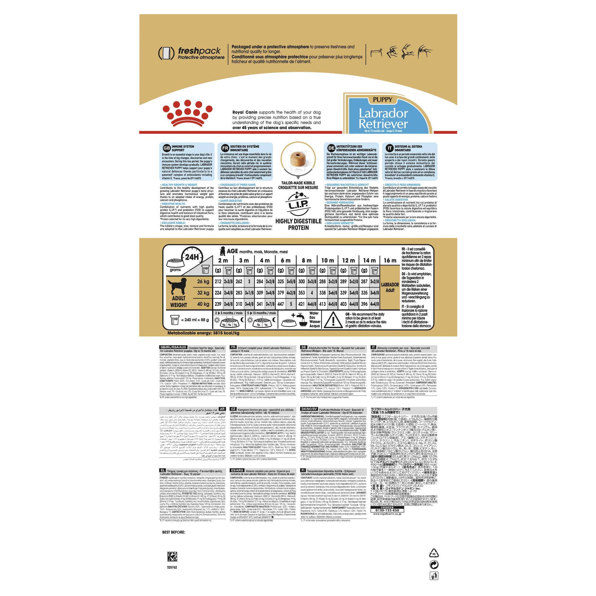 Suitable for puppies up to 15 months old, ROYAL CANIN® Labrador Retriever Puppy is specially formulated with all the nutritional needs of your young Labrador Retriever in mind. Because your puppy’s immune system develops gradually, ROYAL CANIN® Labrador Retriever Puppy contains an exclusive complex of antioxidants – including vitamin E – to help support its natural defences during this key period of growth. Thanks to a specially adapted content of energy, protein, calcium and phosphorus, ROYAL CANIN® Labrador Retriever Puppy contributes to the healthy development of your growing puppy’s bone structure. It also helps to facilitate harmonious weight gain, to help your puppy maintain an ideal weight as it grows. ROYAL CANIN® Labrador Retriever Puppy contains a combination of nutrients with high quality protein (L.I.P.*) and prebiotics (FOS) to support digestive health and balance of intestinal flora. What’s more, they also help to contribute to good stool quality. The kibble in ROYAL CANIN® Labrador Retriever Puppy is tailor-made and specially adapted for the Labrador puppy. The shape and size of the kibble makes it easy for your puppy to pick up and chew, whilst the texture enhances its overall palatability.