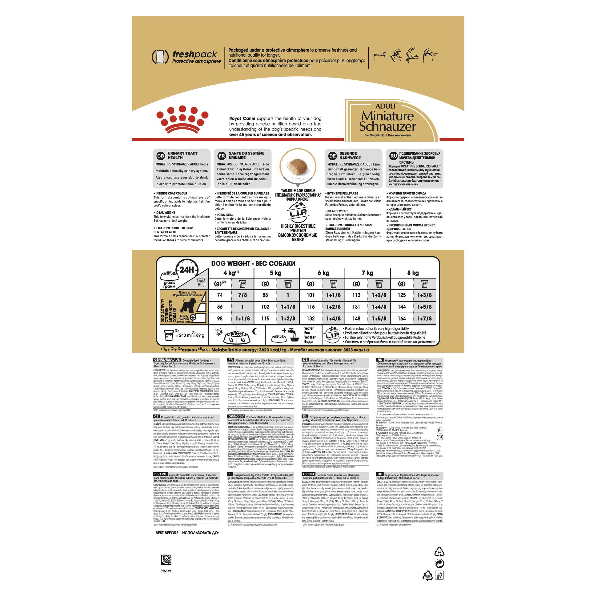 Suitable for dogs over 10 months old, ROYAL CANIN® Miniature Schnauzer Adult is specially formulated with all the nutritional needs of your adult Schnauzer in mind.ROYAL CANIN® Miniature Schnauzer Adult contains an adapted formulation of nutrition that helps to maintain proper urinary function. This dedicated formula of nutrients also encourages your dog to drink more often – this ultimately helps to keep your Schnauzer hydrated to further support the health of its urinary tract.ROYAL CANIN® Miniature Schnauzer Adult contains optimal levels of specific amino acids which help to maintain the natural colour of your Schnauzer’s coat, regardless of its colouring.What’s more, ROYAL CANIN® Miniature Schnauzer Adult has a moderate fat content which – when combined with daily exercise – helps your dog to maintain its ideal weight.The kibble in ROYAL CANIN® Miniature Schnauzer Adult is tailor-made exclusively for the Miniature Schnauzer breed. Thanks to the inclusion of calcium chelators, the formulation of the kibble helps to support your dog’s dental hygiene by slowing down the formation of tartar.