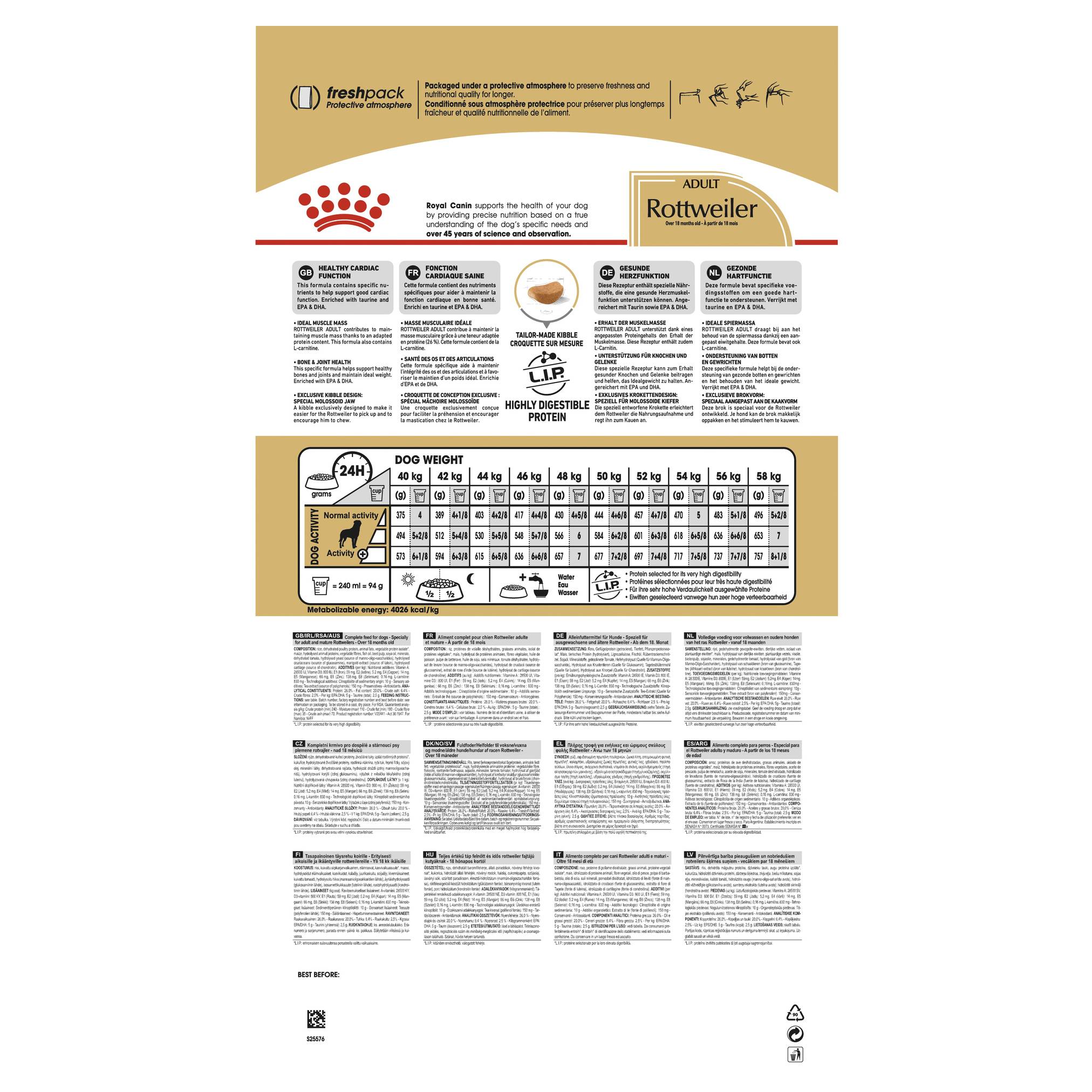 Suitable for Rottweilers aged 18 months old and over, ROYAL CANIN® Rottweiler Adult is specially formulated with all the nutritional needs of your adult dog in mind. ROYAL CANIN® Rottweiler Adult contains specific nutrients – such as taurine, EPA, and DHA – that help to support healthy cardiac function.ROYAL CANIN® Rottweiler Adult also contributes to the maintenance of optimal muscle mass and an ideal bodyweight, thanks to an adapted protein content and the inclusion of L-Carnitine. This diet – rationed appropriately to regulate proper food intake – should be fed in conjunction with an effective exercise routine.Whether working or just on a walk with its owner, the Rottweiler is always active and enthusiastic, which means it requires nutrients that support the health of its joints and bones.This is the reason ROYAL CANIN® Rottweiler Adult has been enriched with EPA and DHA – these omega-3 fatty acids help to support your dog’s healthy bones and joints.What’s more, the exclusive kibble in ROYAL CANIN® Rottweiler Adult is specially designed to make it easier for your dog to pick up, it also encourages it to chew more thoroughly to help increase the feeling of fullness and maintain an ideal weight.