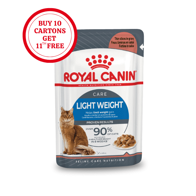 Keeping your cat at an optimum weight for its age and breed type is essential, but sometimes this can prove to be quite difficult. However, you don’t have to reduce its food intake to help manage your cat’s weight, as long as what you feed it is tailored to its specific requirements. ROYAL CANIN® Ultra Light in Gravy helps reduce the calorie intake of cats by as much as 19% to help limit weight gain and maintain a healthy weight bracket. The nutrients are also enriched with L-Carnitine to help support and stimulate a healthy and fast-acting metabolism. When consuming a type of food to maintain a healthy weight, your cat’s diet will play a big part in the maintenance of muscle mass and keeping fat levels at an optimum level. That’s why ROYAL CANIN® Ultra Light in Gravy contains a high protein content to contribute to muscle mass, without compromising the calorie reduction needed to limit weight gain – resulting in a lean, healthy body type for your cat. Additionally, the nutrients in this product support a healthy urinary system for healthy bladder function maintenance. To cater to each cat’s individual preferences, ROYAL CANIN® Ultra Light is also available as dry food, with crunchy and tasty kibble. If you’re considering mixed feeding, simply follow our feeding guidelines to ensure your cat gets an accurate amount of both wet and dry food for optimal benefit.