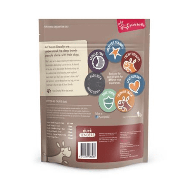 Yours Droolly Duck Tenders 450g are an excellent reward treat. Made with real duck breast fillet as the primary ingredient, you can feel good treating your dog with this firm and chewy delight.